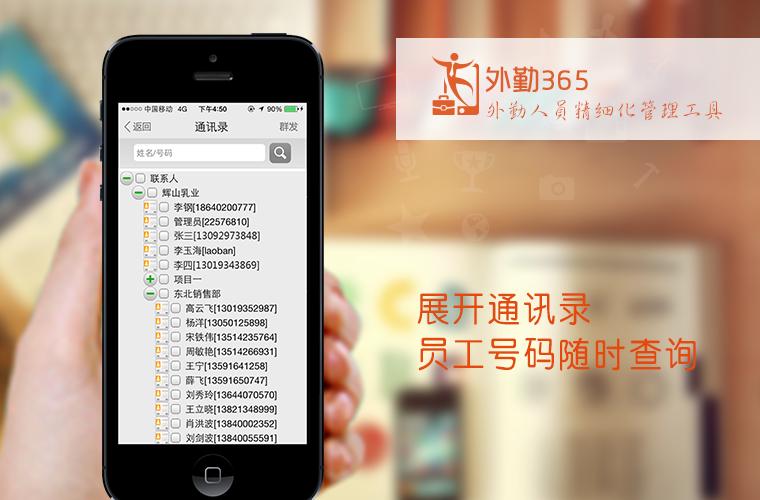 管理业务员拜访过程的第一步是联系业务员。然而在销售部业务员数量众多,把所有业务员的号码一一存到手机又太麻烦。只要手机上安装了外勤365这款软件,想找哪个员工,直接在外勤365的通讯录,就可以直接查询。