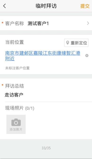 点击“临时拜访”,选择需要拜访的客户,输入拜访总结,进行现场拍照,点击提交即可。