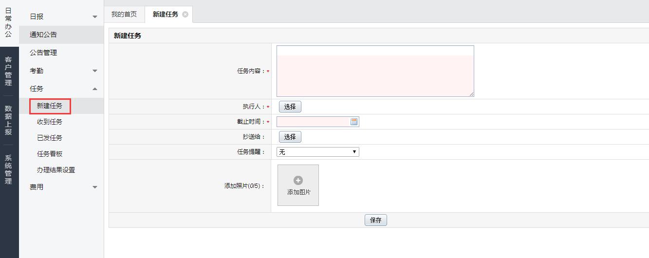 在左侧菜单点击【新建任务】,分别填写:完成期限、办理人员、任务内容,点击保存后,即可将任务转交给处理人员处理。