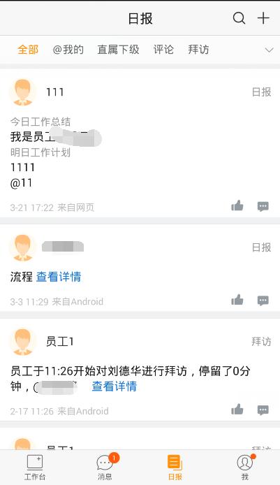 1.手机端点击【日报】菜单,点击‘+’,选择日报模板后发日报,输入日报内容,发送即可。