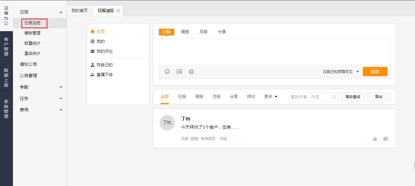 2.电脑端点击【日报】-【日报浏览】菜单,输入日报内容,点击发送即可提交。