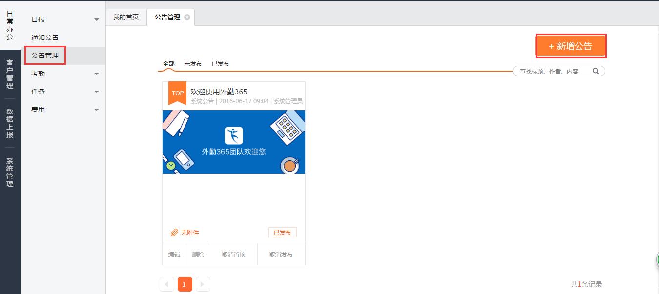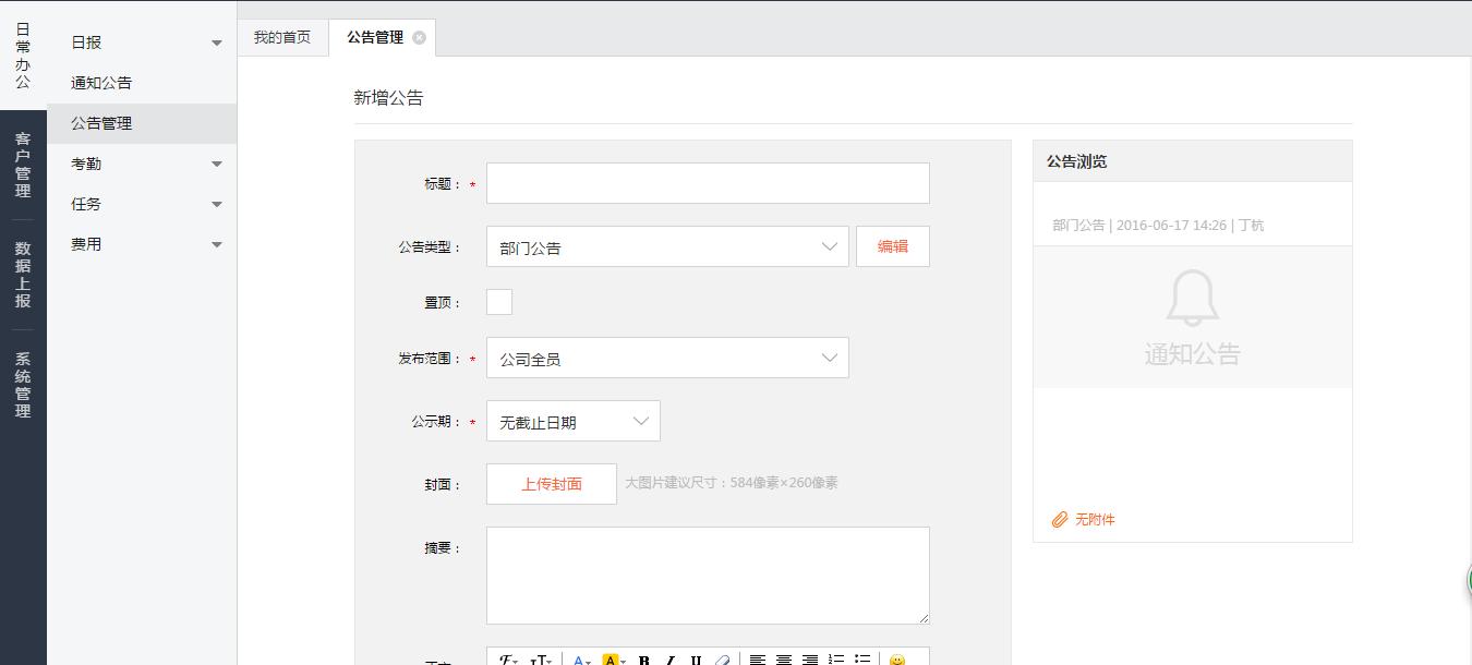 1.web端使用管理员账号登陆,点击【日常办公】——>【公告管理】,发布公告。