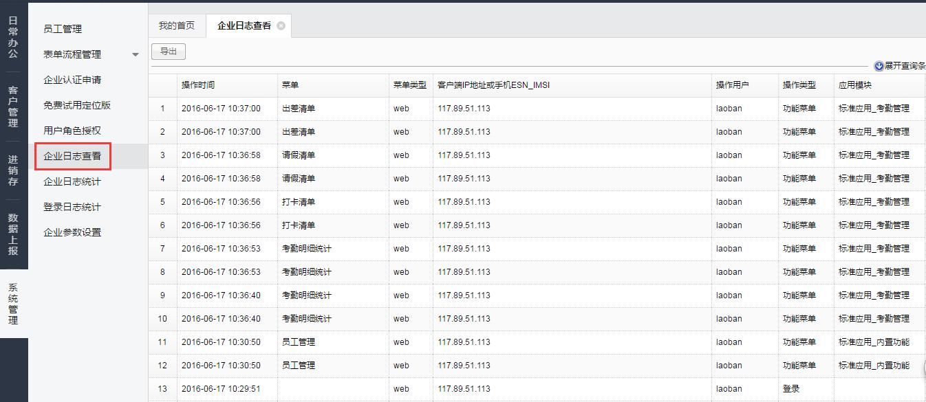2.通过【企业日志查看】,可以查看到企业员工使用系统的相关情况;