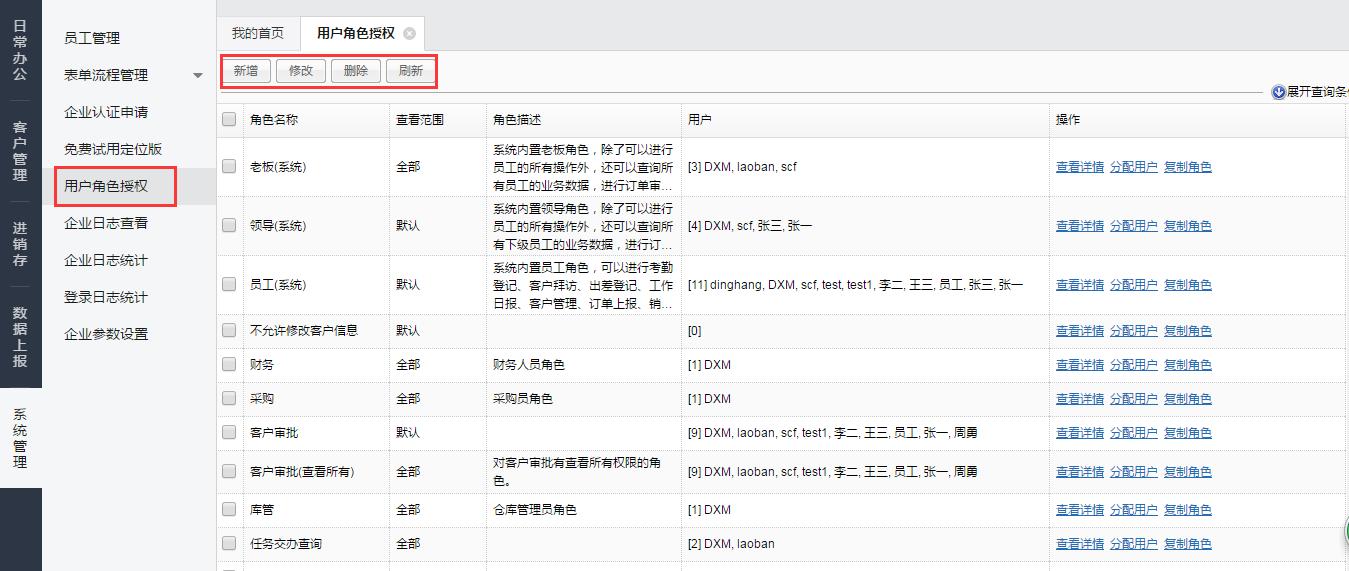 1.通过用户角色授权,可以新增、修改角色,给员工分配角色;