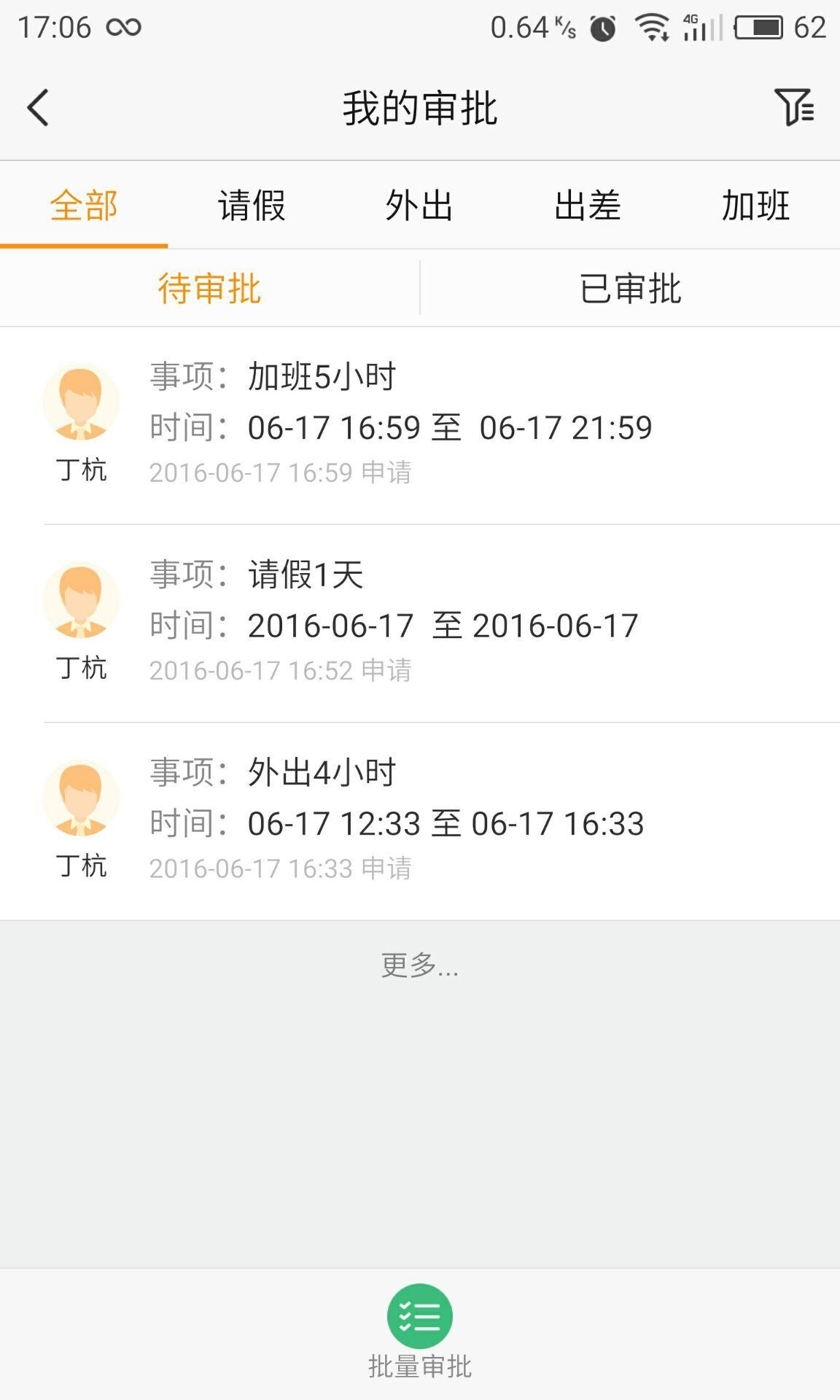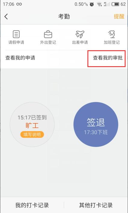 领导在手机端可以对下属的请假、外出、出差和加班申请进行审批,点击“查看我的审批”,在列表中选择需要审批的记录进行审批。