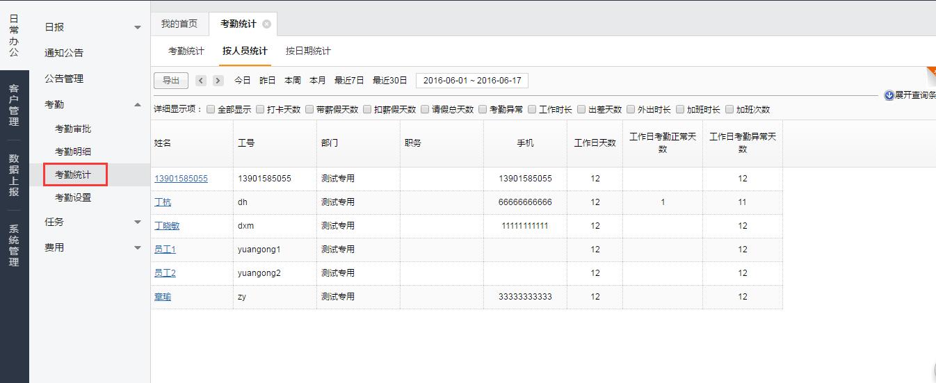 在左侧菜单点击【考勤统计】,可以看到考勤正常率统计、按人员统计和按日期统计,根据需要可以自行选择需要详细显示的项目,支持导出;