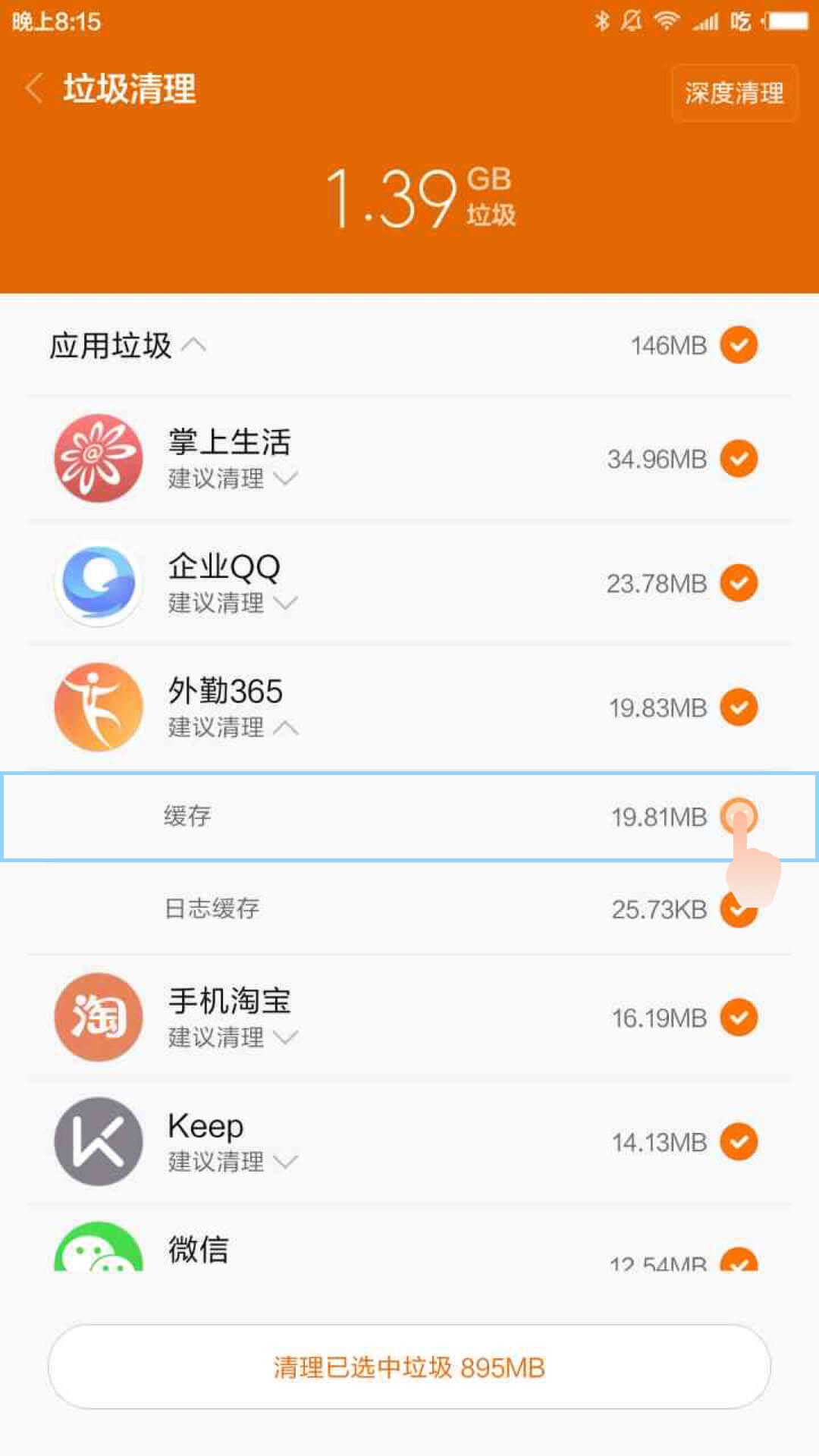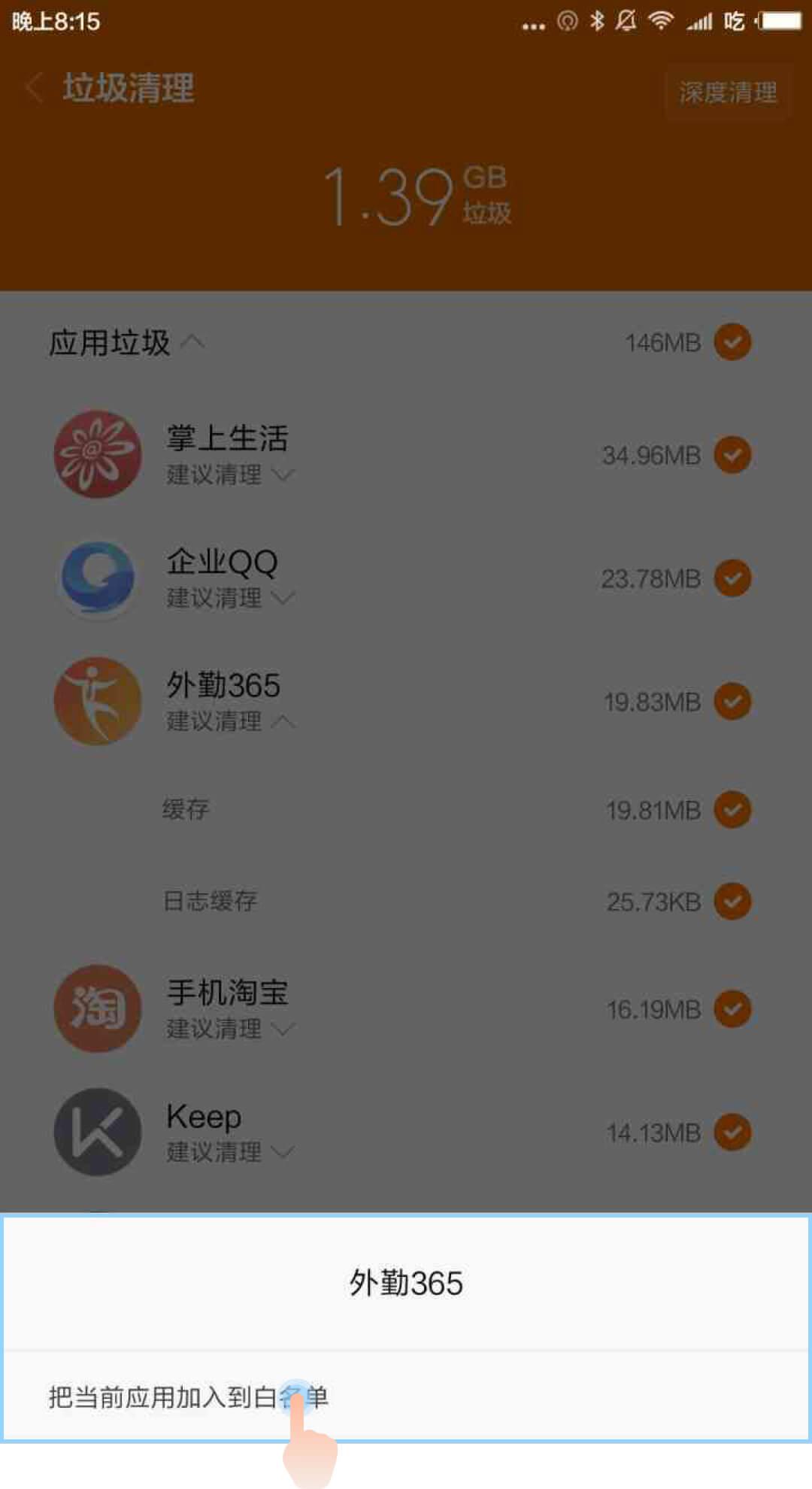 1、进入安全中心—>垃圾清理—>外勤365"日志缓存",将外勤365加入缓存白名单;