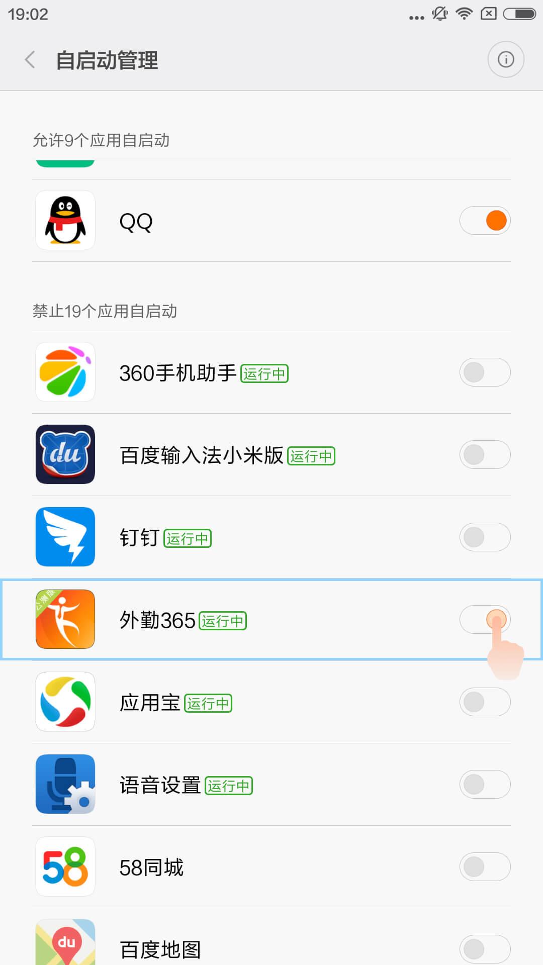 3、进入授权管理—>自启动管理 允许外勤365自启动;