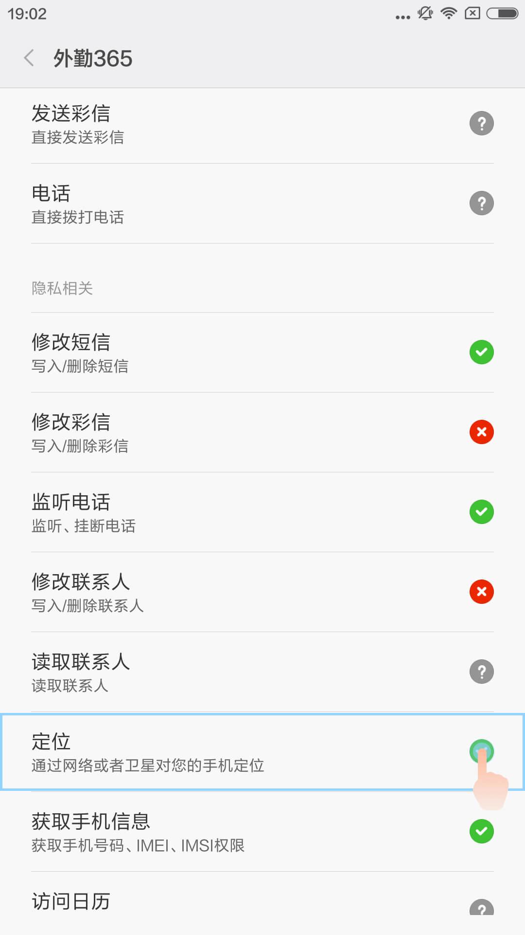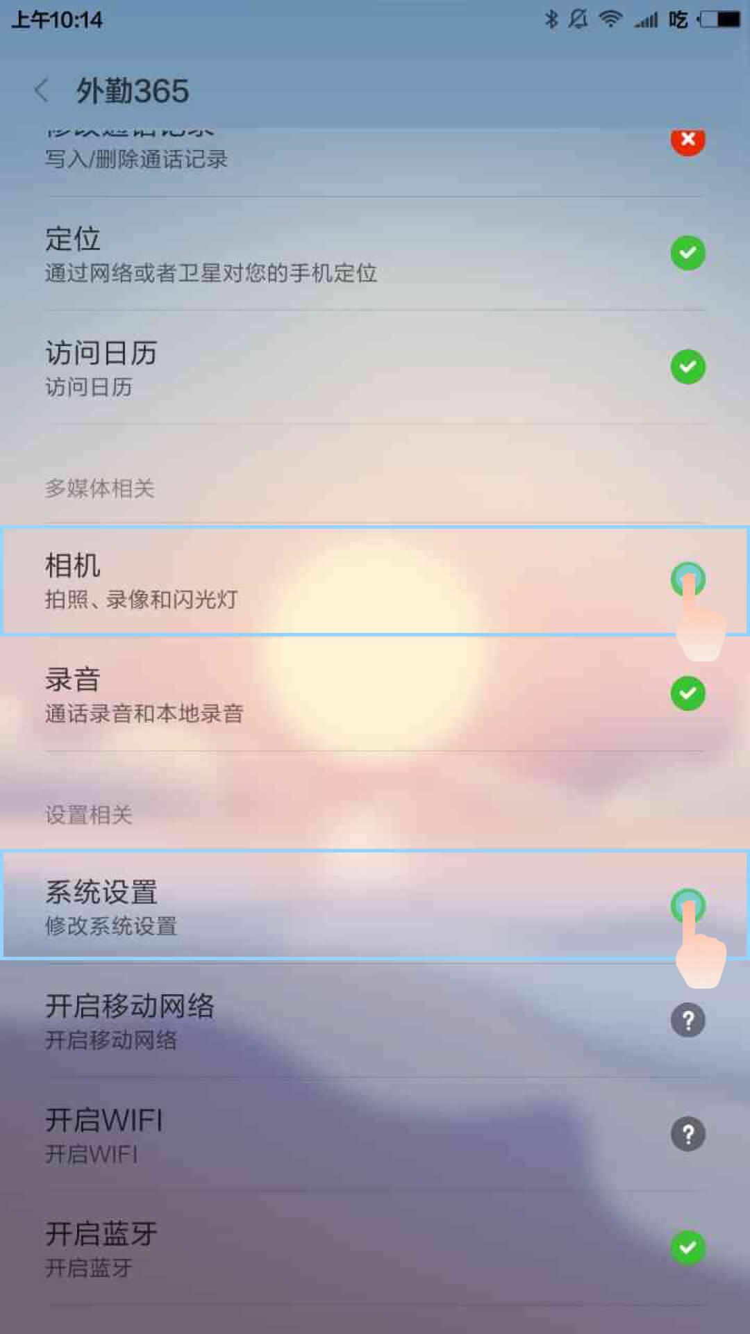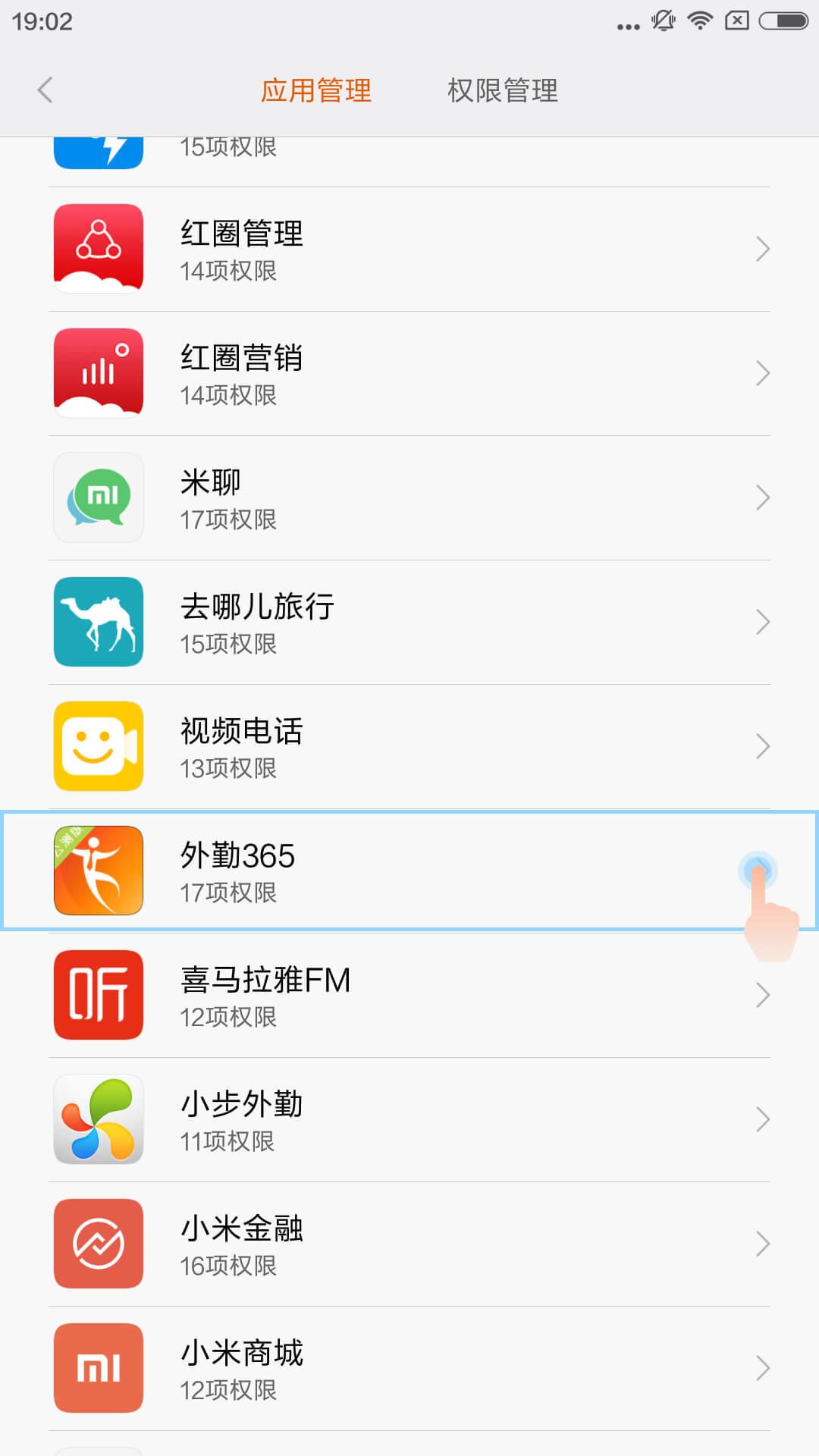 4、进入授权管理—>应用权限管理 分别允许外勤365定位、相机、系统设置权限