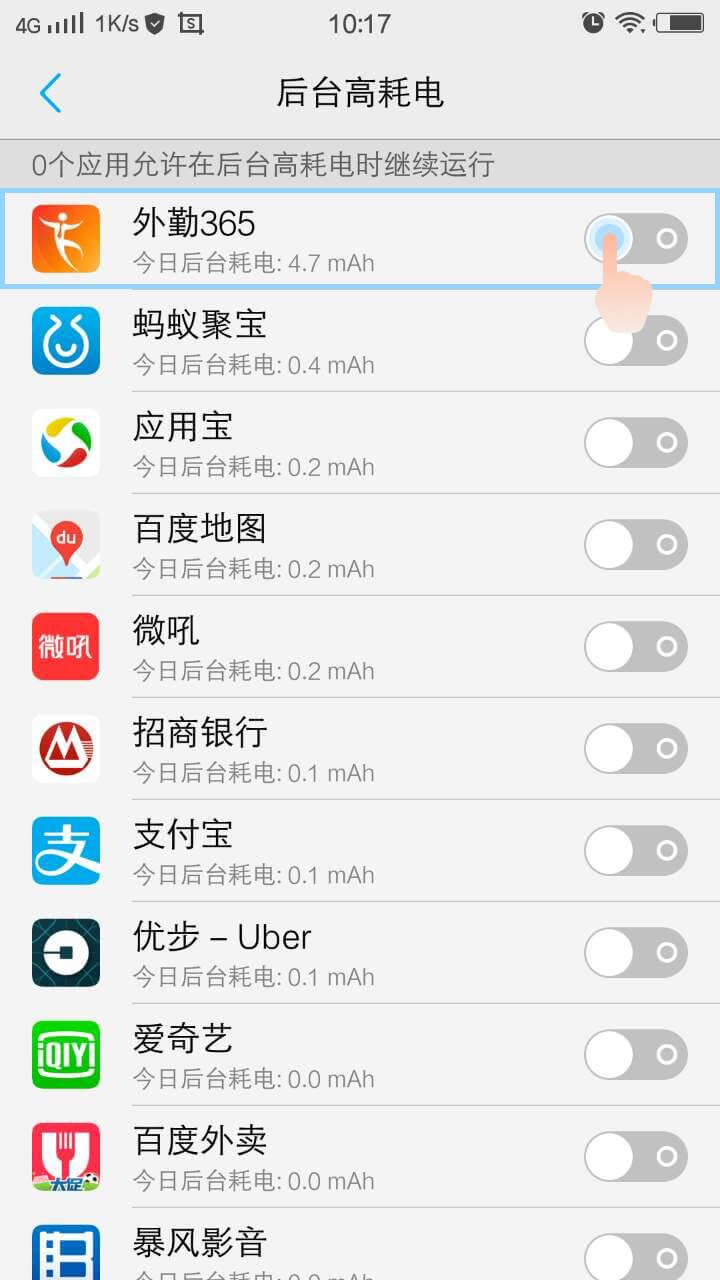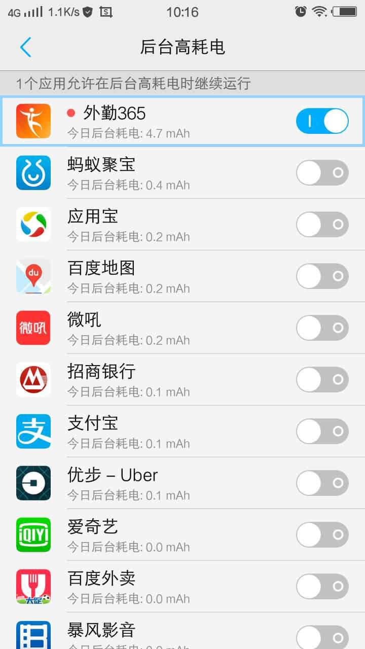 5.后台高耗电设置:选择外勤365--取消后台高耗电禁止运行