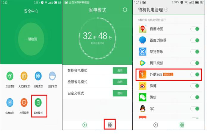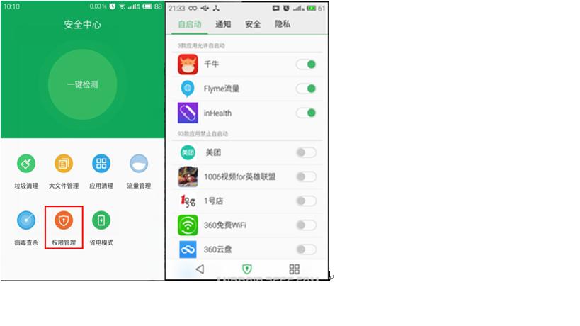 1、进入安全中心—>权限管理—>自启动 外勤365打开自启动