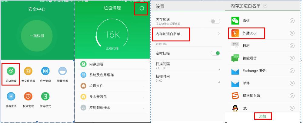 2.进入安全中心—>垃圾清理—>右上方设置—>内存加速白名单 外勤365打开