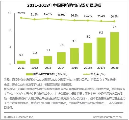 艾瑞咨询2011-2018年中国网络购物市场交易规模