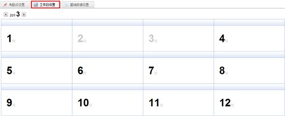 企业系统管理员在 “工作日设置”界面,可对工作日进行设置;默认显示当年的所有月份,黑色标记的为未设置的月份,灰色标记的为已设置的月份,如下图所示: