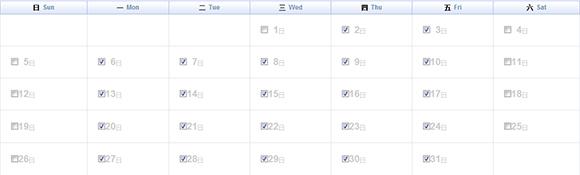 点击某个月份,显示该月的所有日期,缺省周一至周五为工作日,如下图所示: