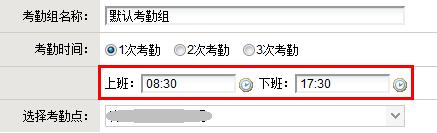 企业系统管理员可在考勤组中设置上下班时间。系统提供了默认的考勤组,默认设置为一组考勤,即一次上班考勤和一次下班考勤;在考勤组中设置上下班时间,如下图所示: