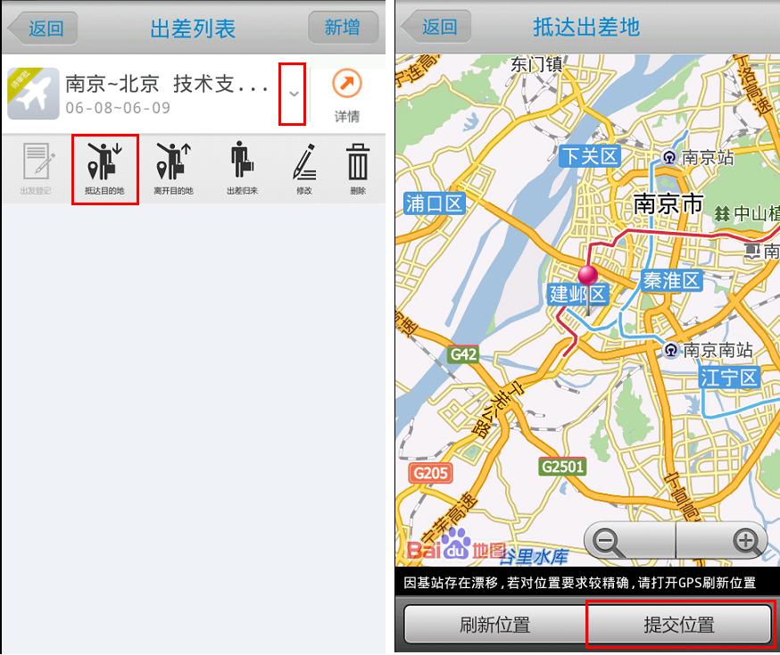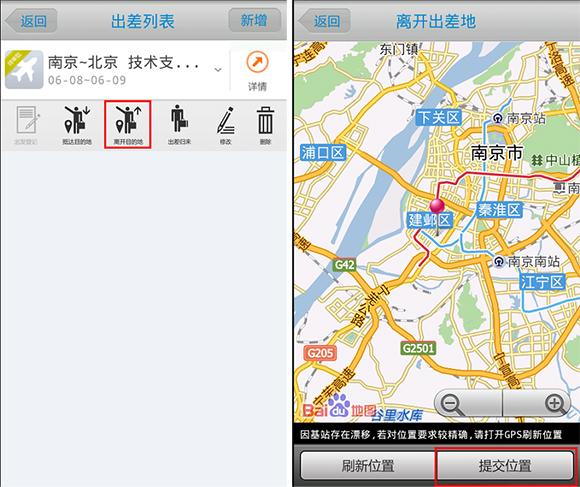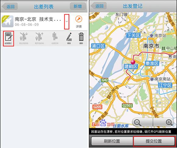 员工在出差前,需要提交出发登记,记录出发的时间、地点;点击出差申请信息,在功能操作列表中,选择【出差登记】,待等位成功后,提交位置;