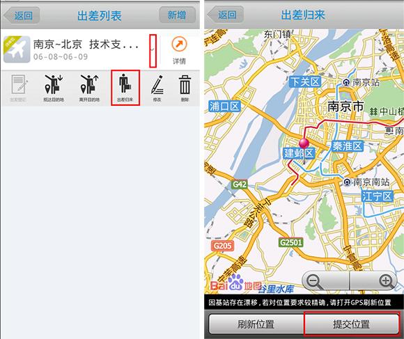 最后,员工出差完毕,返回公司,需要执行出差归来的操作,记录出差归来的时间、地点;点击出差申请信息,在功能操作列表中,选择【出差归来】,待等位成功后,提交位置;