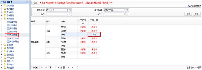 同时,领导和员工也可在电脑端,查看详细的出差情况;在【考勤明细】中,点击某员工的出差记录;
