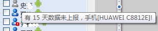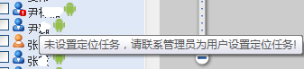 将鼠标移到小人上,能看到一些提示信息,如上图,移到灰色的小人上,能看到此人有15天没有上报定位数据了,到下图,可以看到感叹号的小人是没有设置定位任务