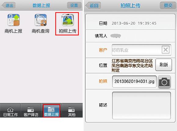 我们登陆外勤365手机客户端,在功能列表中找到“拍照上传”功能,点击进入后,选择我们的客户信息,点击“ ”进入到照相机,拍照完成后保存返回拍照上传表单,可以对本次拍照进行描述,详细描述照片所呈现的内容,最后点击“提交”,将照片上传到外勤365的后台;