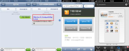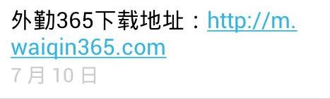 我们编辑短信“下载外勤365”发送到12114,系统会下发手机客户端下载链接到手机上,点击该链接(注意:手机需要开启数据流量,保证手机能上网),会使用手机默认的浏览器打开下载页面;