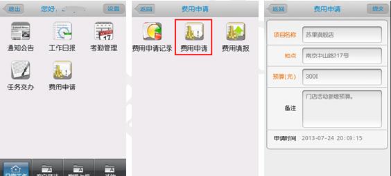 业务员在手机上登录外勤365客户端,在费用申请模块中选择【费用申请】,填写相关事由和预算金额,然后提交;