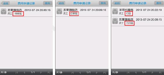 领导和业务员可以在手机端查询费用申请的记录,在费用查询里,可看到费用申请的状态,比如待审批、已审批、打回和已归档;