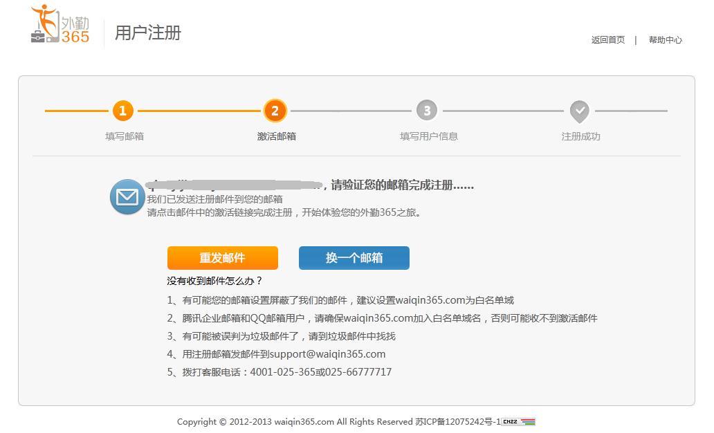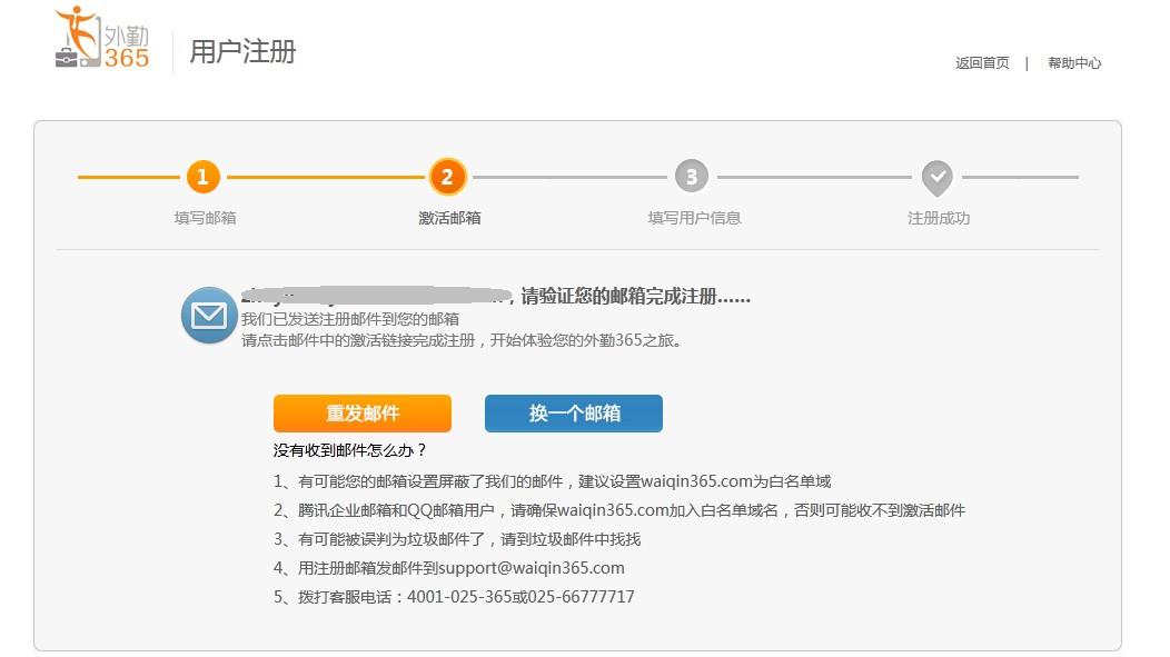 外勤365系统会发一封激活邮件到我们的注册邮箱,如果没有接受到激活邮箱,可点击“重发邮件”,如果我们的邮箱填写错误,可点击“换一个邮箱”;
