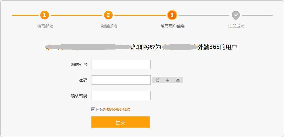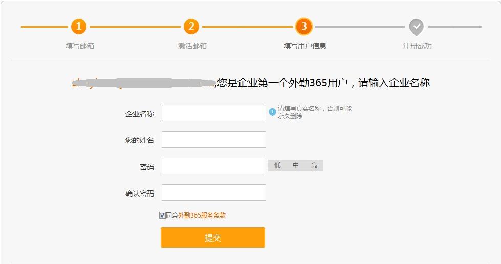 在填写用户信息页面,填写企业名称、姓名和密码等信息,例如:企业名称为外勤365,姓名为老板,填写完成后,点击“提交”;