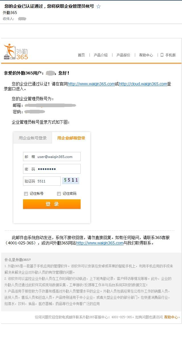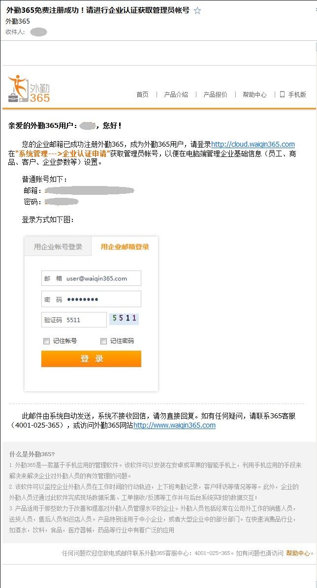 外勤365系统会将我们的注册信息发送在邮箱里面,请大家及时查收邮件,并妥善保管账号及密码;