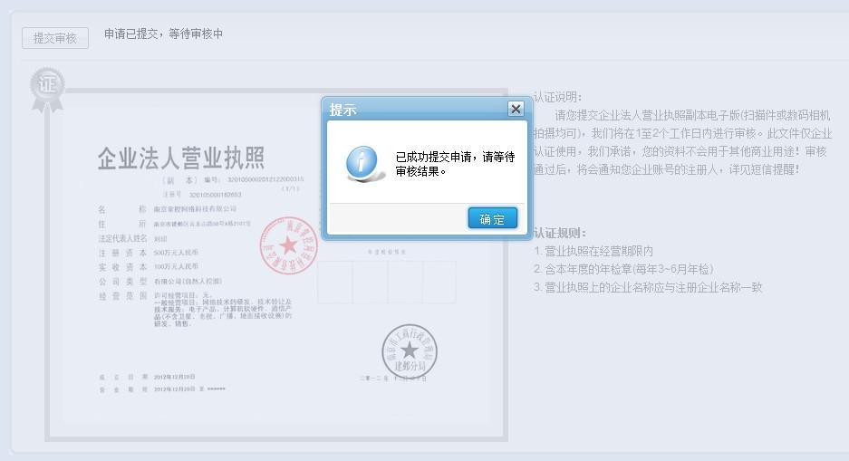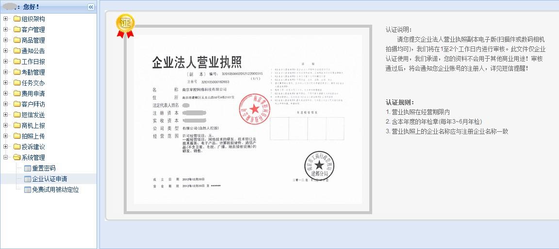 登录到系统之后,在【系统管理】——>【企业认证申请】中,提交我们公司的营业执照;