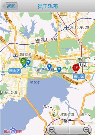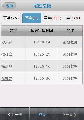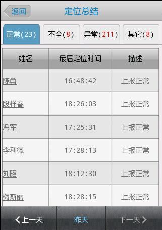 我们使用领导的账号登录移动外勤365手机客户端,点击“定位总结”,可以看到定位任务状态不同的员工信息;定位状态分正常、不全、异常和其它,每个状态显示了相应的人数和人员清单;在状态为正常的清单中选择一名员工,点击他的姓名,可查看该员工一天的轨迹;