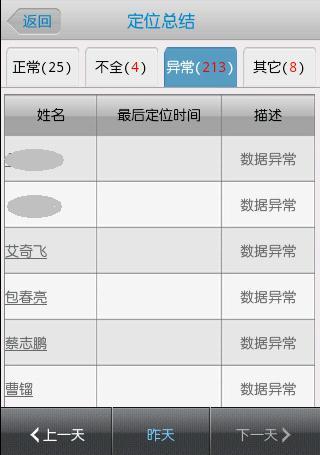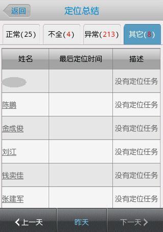 在状态为其他的清单中,我们可以查看到还有哪些员工为设置或者未接受位置跟踪任务,我们可以及时联系员工,让他们登录手机客户端,接收位置跟踪任务。