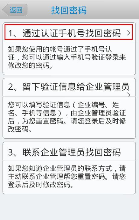 员工的外勤365账号和手机进行过认证之后,员工就可以通过手机认证来找回自己的密码。
