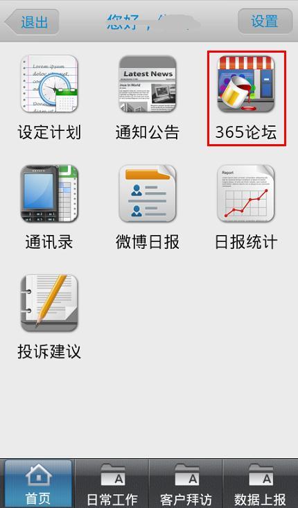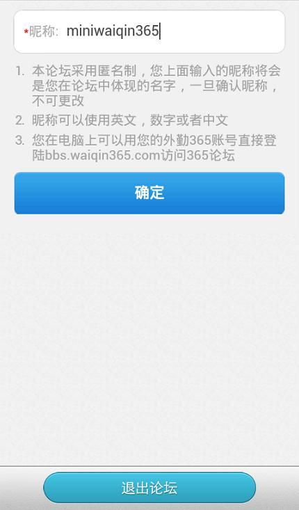 用自己的外勤365账号在手机端登录外勤365系统,在首页,我们选择“365论坛”,第一次登陆会设置论坛的昵称,正确填写后点击确定,就能登录到论坛中。