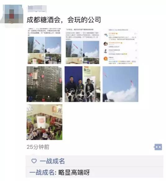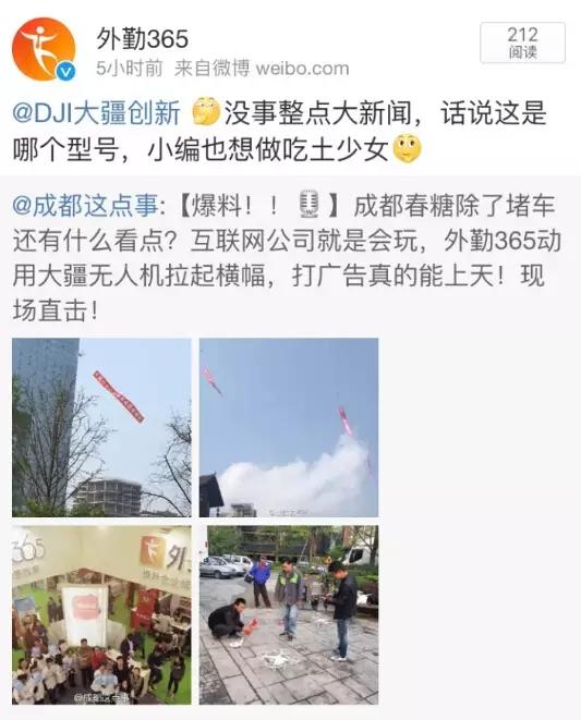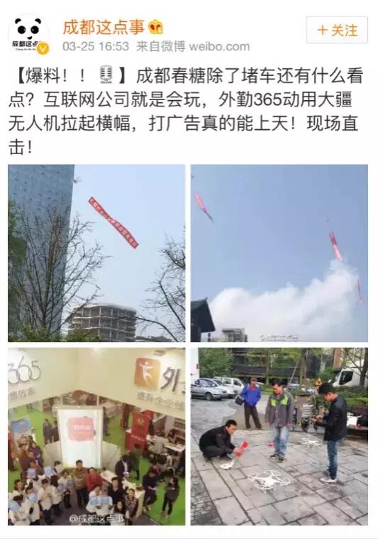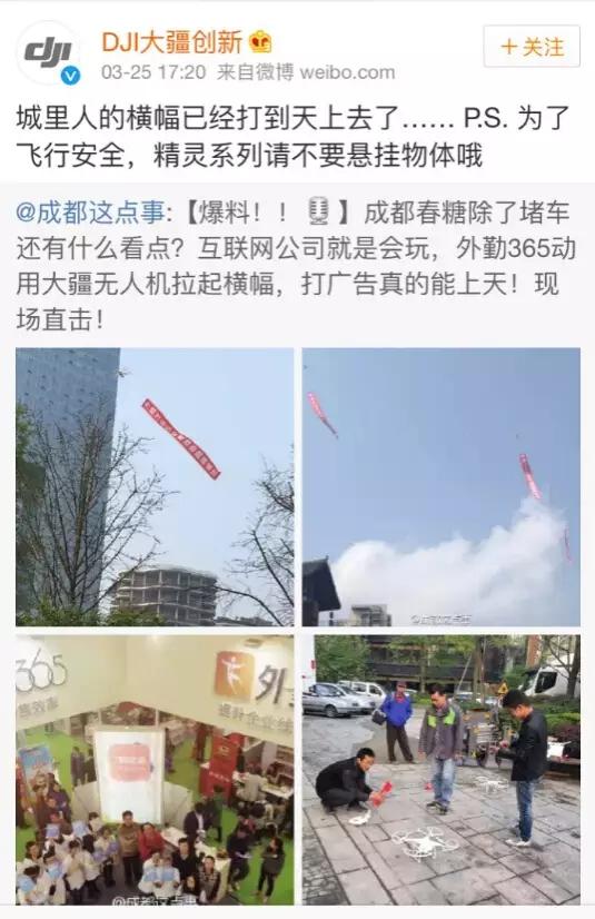 参加糖酒会的亲们,被空中的大疆无人机“撩”了没? 像这样 还有这样 这不是土豪的专属玩具——大疆无人机吗?! 连大疆无人机都来凑糖酒会热闹,成都本地76W粉丝的大V也坐不住了 事件主人公被炸出来了 大疆无人机本尊也凑个热闹,来了个友情提示 原来这是外勤365的户外广告 用6架无人机齐刷刷在空中打广告,市场部也是太拼了 还真上天了…… 大疆无人机在春糖展馆抢足了风头,朋友圈纷纷转发 “偏执创新,极致产品”是大疆无人机的产品理念,而同样,创新也是外勤365生命的本源力量,从产品到营销方式,外勤365以激进、固执的力量投入创新,不断优化产品体验,为我们的客户提供极致服务,帮助企业提升线下销售效率,你还不快试一试?
